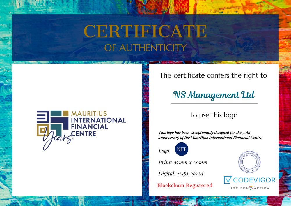 CERTIFICATE OF AUTHENTICITY Blockchain Registered NFT This logo has been exceptionally designed for the 30th anniversary of the Mauritius International Financial Centre Logo Print: 37mm x 20mm Digital: 115px @72d NS Management Ltd to use this logo This certificate confers the right to