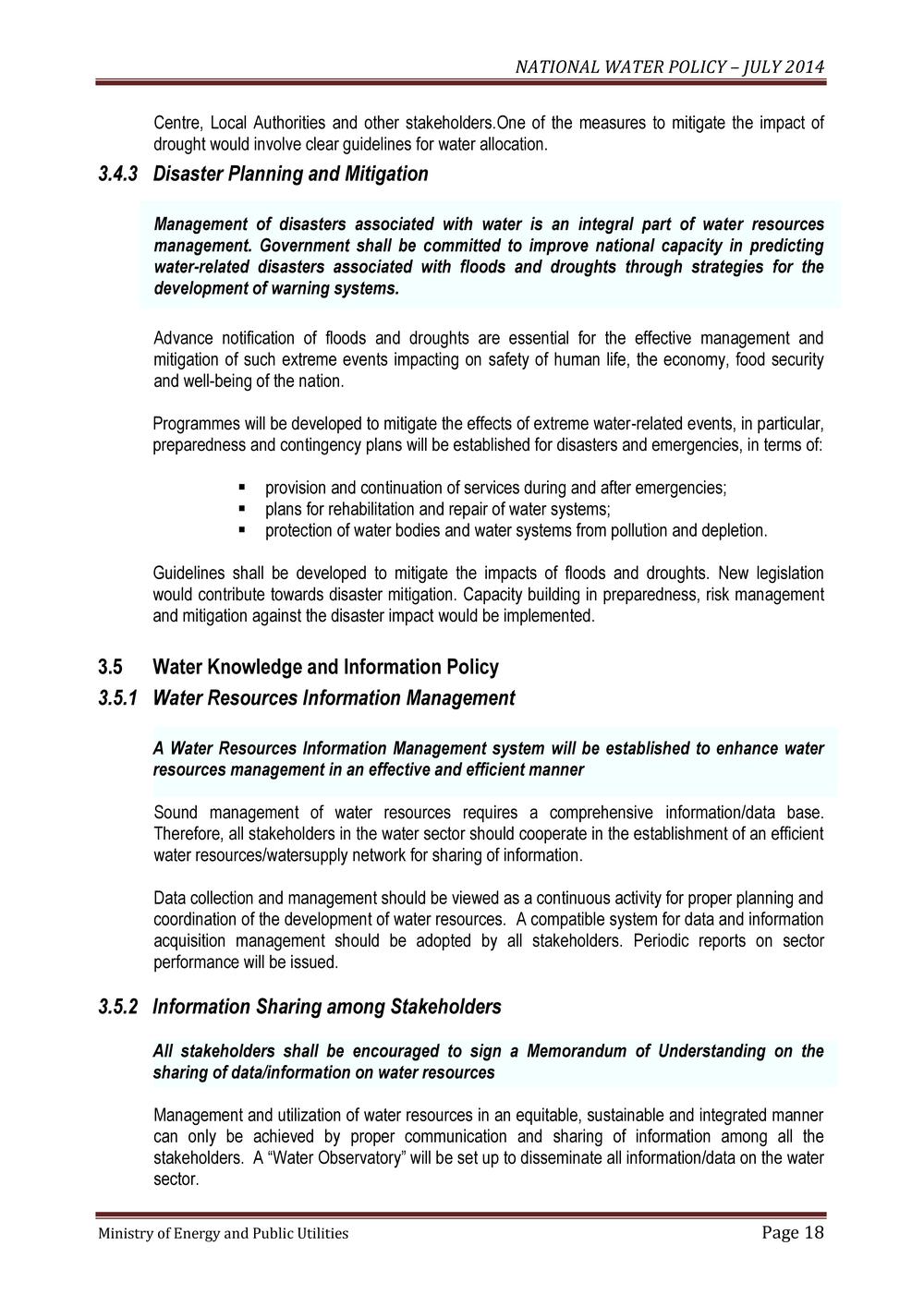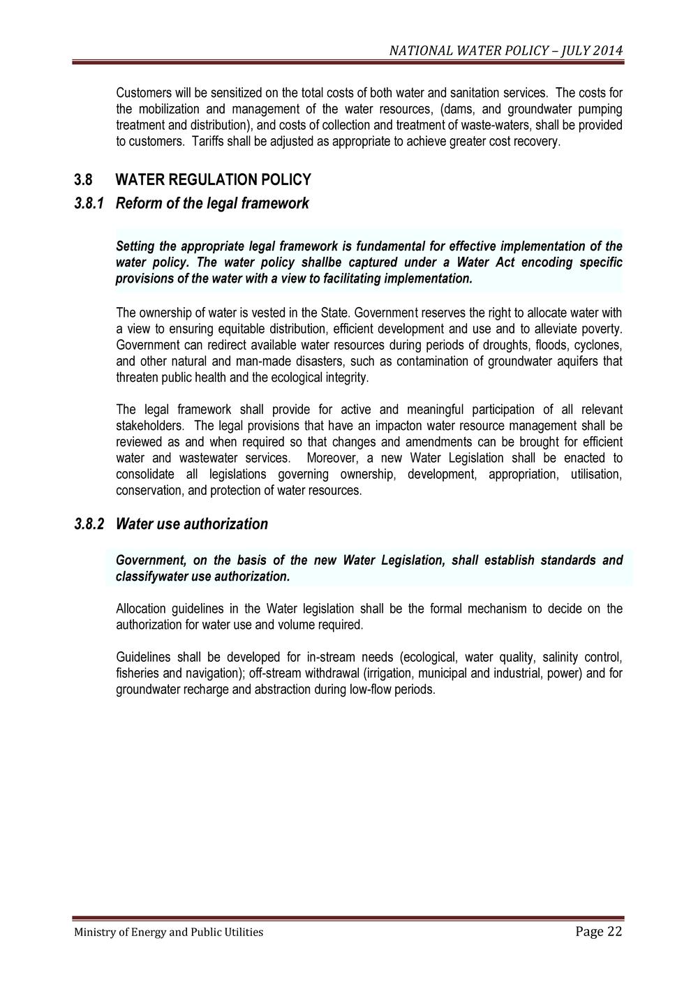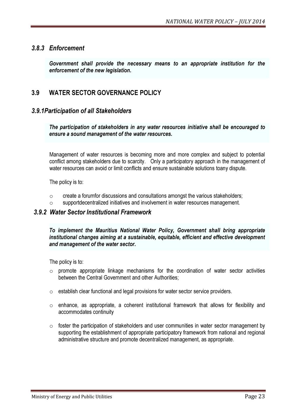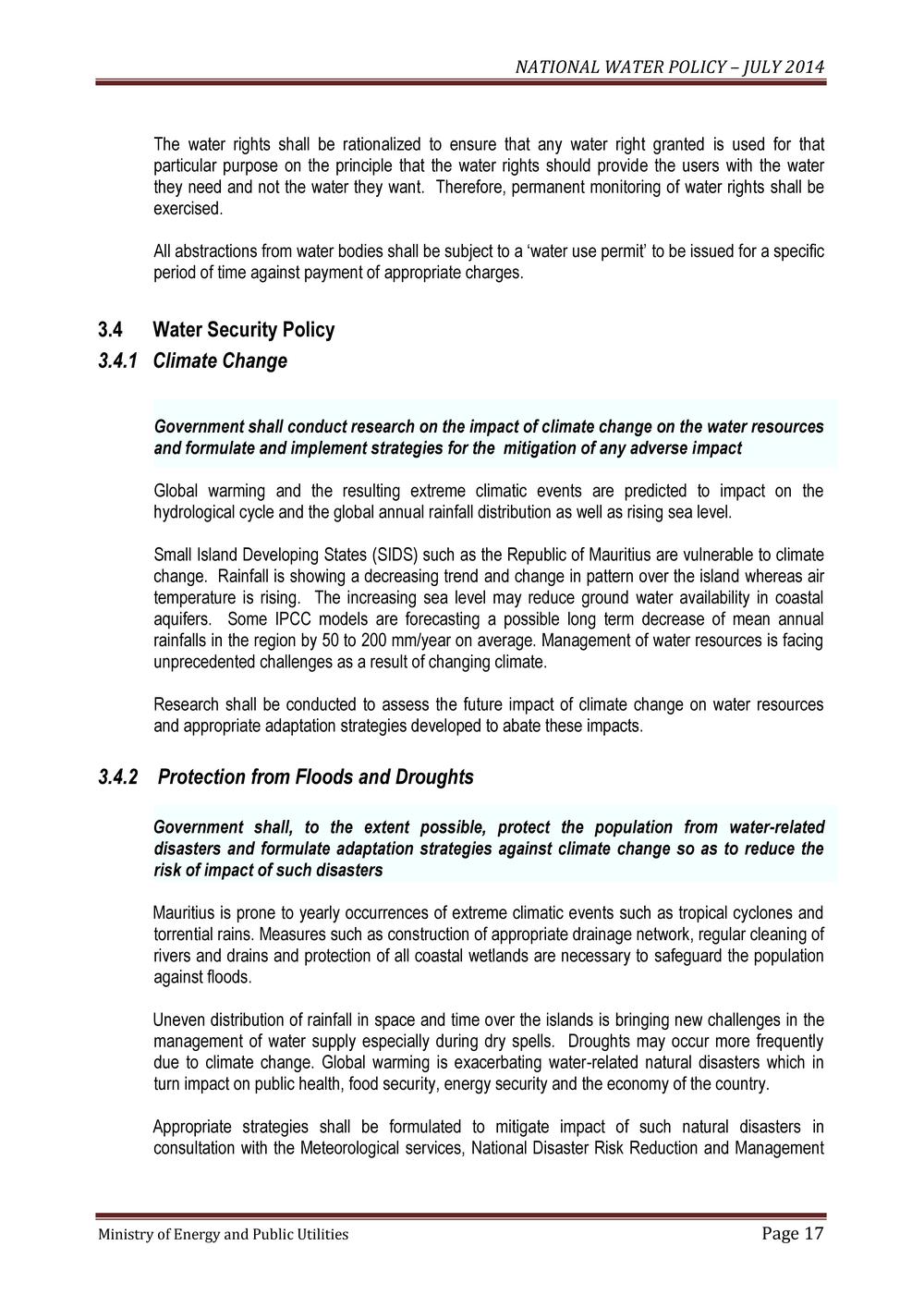 NATIONAL WATER POLICY – JULY 2014 Ministry of Energy and Public Utilities Page 1 Government of Mauritius NATIONAL WATER POLICY Ministry of Energy and Public Utilities July 2014 CONTENT NATIONAL WATER POLICY – JULY 2014 Ministry of Energy and Public Utilities Page 2 PREAMBLE PAGE 1.0 BACKGROUND 5 1.1 Country overview 5 1.2 Need for water policy 6 2.0 GOALS AND OBJECTIVES OF THE NATIONAL WATER POLICY 7 2.1 Vision 7 2.2 Values 7 2.3 Objectives 8 3.0 THE NATIONAL WATER POLICY 9 3.1 General and Sectoral Water Policy Statements 9 3.1.1 Water for socio-economic development and environmental sustainability 9 3.1.2 Water for drinking and sanitation 9 3.1.3 Water for agriculture and food security 10 3.1.4 Water for energy development 11 3.1.5 Water for industrial development 12 3.1.6 Water for tourism development 12 3.1.7 Water for sports and recreation 12 3.1.8 Water and the environment 12 3.2 WATER RESOURCES DEVELOPMENT POLICY 13 3.2.1 Dam development and management 13 3.2.2 Alternative sources of water supply 13 3.2.3 Rehabilitation and maintenance of water and wastewater infrastructure 14 3.3 WATER RESOURCES MANAGEMENT POLICY 14 3.3.1 Water resources management 14 3.3.2 Integrated water resources management 14 3.3.3 Water quality management 15 3.3.4 Conservation and protection of water resources 15 3.3.5 Water demand management 15 3.3.6 Water allocation and apportionment 16 NATIONAL WATER POLICY – JULY 2014 Ministry of Energy and Public Utilities Page 3 3.4 WATER SECURITY POLICY 17 3.4.1 Climate change 17 3.4.2 Protection from floods and droughts 17 3.4.3 Disaster planning and mitigation 18 3.5 WATER KNOWLEDGE AND INFORMATION POLICY 18 3.5.1 Water resources information management 18 3.5.2 Information sharing among stakeholders 18 3.6 WATER CAPACITIES DEVELOPMENT POLICY 19 3.6.1 Human resources development 19 3.6.2 Stakeholder participation in capacity building 19 3.6.3 Capacity building and training 19 3.6.4 Technology transfer and applied research 19 3.7 WATER FINANCING AND PRICING POLICY 20 3.7.1 Financial sustainability 20 3.7.2 Funding of water sector infrastructure 20 3.7.3 Private sector participation 21 3.7.4 Water pricing policy 21 3.8 WATER REGULATION POLICY 22 3.8.1 Reform of the legal framework 22 3.8.2 Water use authorization 22 3.8.3 Enforcement 23 3.9 WATER SECTOR GOVERNANCE POLICY 23 3.9.1 Participation of all stakeholders 23 3.9.2 Water Sector Institutional Framework 23 3.9.3 Monitoring and evaluation 24 4.0 STRATEGIC PRIORITIES FOR THE WATER SECTOR 25 5.0 CONCLUSION 26 NATIONAL WATER POLICY – JULY 2014 Ministry of Energy and Public Utilities Page 4 PREAMBLE The Mauritius National Water Policy (NWP) is based on Government socio- economic policies and development strategies, as well as national objectives and targets defined for the water and sanitation sectors. It is also based on national principles of integrated water resources management that would enhance sustainable development of the country. The NWP stresses the value of a holistic approach which recognizes the extensive and inter-sectoral decision making process about water. An integrated management approach needs to be adopted due to the linkage between the sectoral development goals and management of water resources. Policies are essentially selected options to be used as instruments for achieving intended governmental goals and objectives. The NWP will serve as a broad framework to promote sustainable development and translate into practice all water development strategies and water and sanitation action plans to meet the water requirements of all sectors of the economy. The NWP will be reviewed periodically so that it is a useful guide to manage the country's water sector for all the concerned Ministries, Agencies, Departments, local authorities and the private developers as well as those who are assigned the responsibilities for water related services. NATIONAL WATER POLICY – JULY 2014 Ministry of Energy and Public Utilities Page 5 1. 0 BACKGROUND 1.1 Country Overview Mauritius, as the main island of the Republic of Mauritius, comprises an area of 1870 km2 and surrounded by fringing coral reefs. As a result of its volcanic origin and the high permeability of underlying rocks, most of the rivers and rivulets on the island originate from the central plateau. The second main island is Rodrigues, situated at some 560 km to the east of Mauritius. It is about 18 km long and 6.5 km wide with an area of 110 km2. The climate is a tropical one with only two seasons, winter prevailing from May to October and summer from November to April. The average annual precipitation over the island is 2000 mm, (long term mean over period 1971 to 2000) varying from 1500 mm on the east coast to 4000 mm on the central plateau and 900 mm on the west coast. The wettest month is February and driest month is November. In Mauritius, the replenishment of water resource systems occurs during the summer season, when two thirds of the mean rainfall is harvested, out of which, about 65% emanate from tropical cyclones. However, rainfall events of 300 mm or more can be expected once a year over Mauritius as a result of cyclones in the Indian Ocean. The average annual precipitation in Rodrigues is around 1100 mm. The Mauritian economy has diversified from a sugar cane monocrop economy in the 1970s to one based on manufacturing (textiles and garments) and tourism in the 1980s. The Republic of Mauritius has set up an ambitious objective to move away from a 'preference based' economy to one which will be globally competitive. Accordingly, it has embarked on a major economic reform programme to encourage and attract investment, know-how and technology as well as the overhauling of the present investment environment through the Business Facilitation Act and the re-structuring of the economy through the re-engineering of existing sectors such as sugar, textile and tourism while encouraging the emergence of new sectors such as financial services, sea