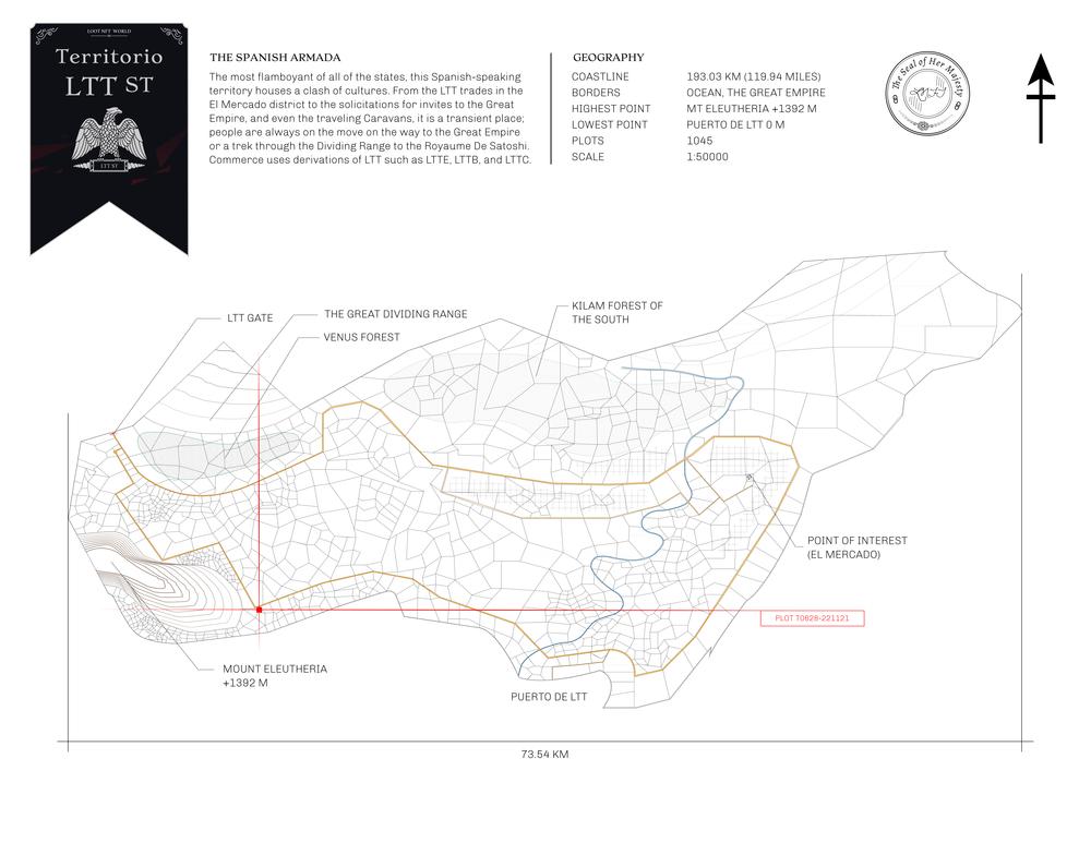 Isle of Fund HABN Island Vault Atoll Royaume de Satoshi Kingdom of X by SL Territorio LTT ST e Great Empire e S eal of Her M a j e s t y LOOT NFT WORLD The most amboyant of all of the states, this Spanish-speaking territory houses a clash of cultures. From the LTT trades in the El Mercado district to the solicitations for invites to the Great Empire, and even the traveling Caravans, it is a transient place; people are always on the move on the way to the Great Empire or a trek through the Dividing Range to the Royaume De Satoshi. Commerce uses derivations of LTT such as LTTE, LTTB, and LTTC. e S eal of Her M a j e s t y COASTLINE BORDERS HIGHEST POINT LOWEST POINT PLOTS SCALE GEOGRAPHY 193.03 KM (119.94 MILES) OCEAN, THE GREAT EMPIRE MT ELEUTHERIA +1392 M PUERTO DE LTT 0 M 1045 1:50000 THE SPANISH ARMADA Territorio LTT ST LOOT NFT WORLD LTT ST 73.54 KM LACHESIS +3139 M KLOTHO +2978 M THE GREAT DIVIDING RANGE ATROPOS +1567 M THE THREE SISTERS MOUNTAIN LANDS KILAM FOREST OF THE SOUTH VENUS FOREST MOUNT ELEUTHERIA +1392 M PUERTO DE LTT POINT OF INTEREST (EL MERCADO) THE GREAT DIVIDING RANGE LTT GATE PLOT T0628-221121 Territorio LTT ST LOOT NFT WORLD LTT ST H.M.LNFTLandRegistry TITLE NUMBER ISSUED ADMINISTRATIVE AREA SCALE T0628-221121 22 November 2021 TERRITORIO LTT ST Type W-T: Share of 0.1% of all BUN sales (rewarded in Credits) plus 1% of all LTT redeemed based on number of NFT Stories minted; Mint 4 NFT Stories 1/50000 OWNER ENTITLEMENT e S eal of Her M a j e s t y TERRITORIO HIGHWAY BOUNDARY: 2.01 KM e S eal of Her M a j e OFFICIAL PERSPECTIVE SHEET FOR FILING Indicate vantage point for each drawing. Copy and mark each sheet required prior to filing. Guide - Vantage point should be indicated as shown in the diagram: